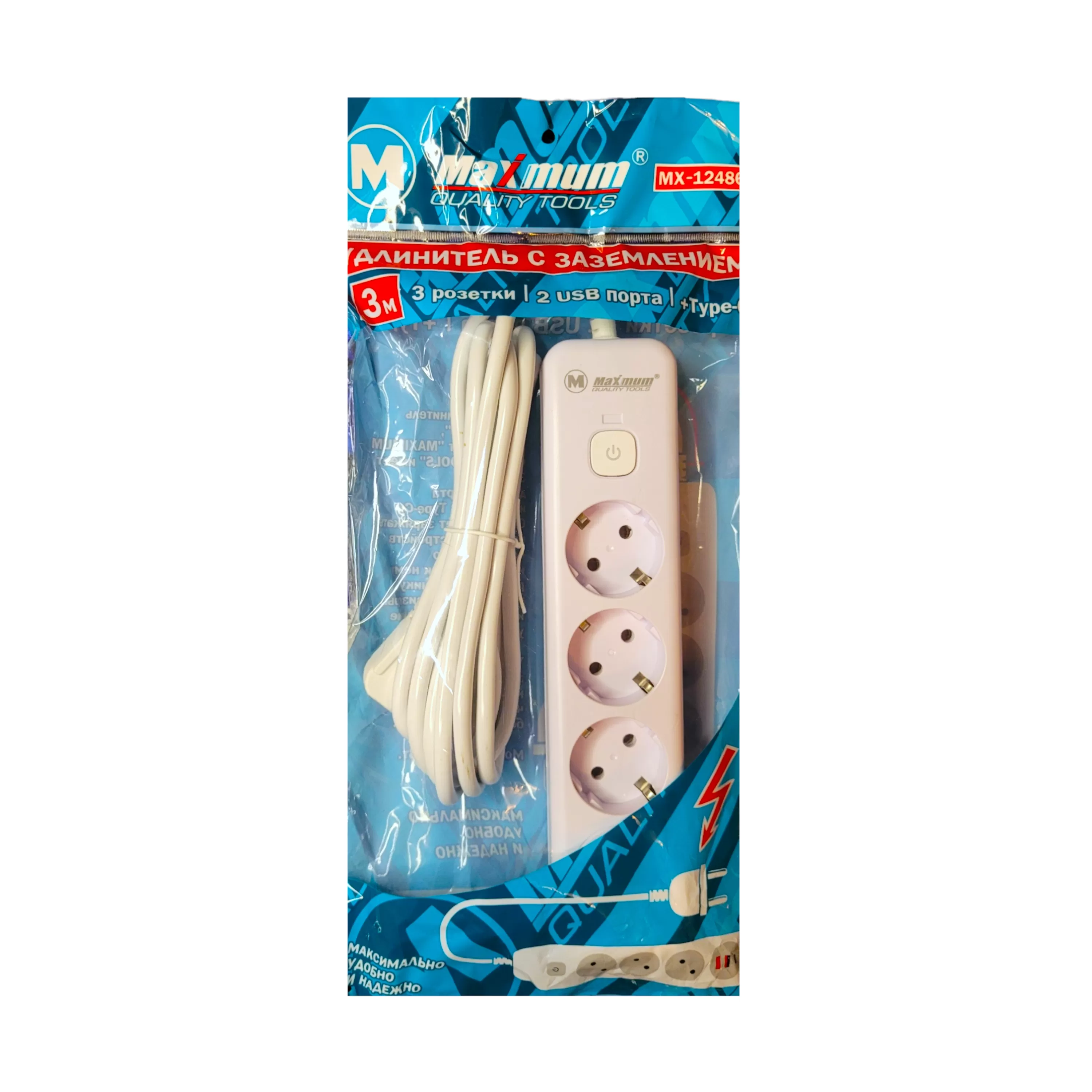 Удлинитель с заземлением 2 м, глубокий, 3 EURO розетки, 5 USB портов,Type C, U 314, "MAXIMUM" MX 147