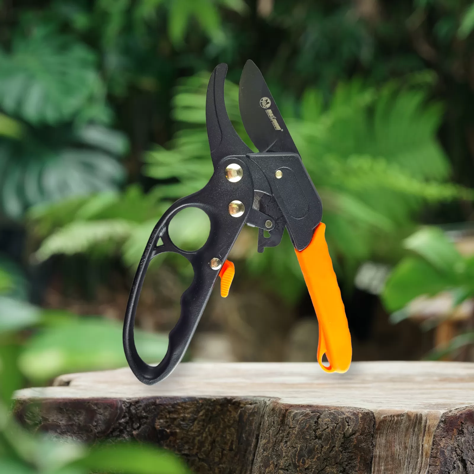 Секатор с храповым механизмом от Maximum quality tools предназначен для резки веток, кустарников и деревьев до 2 см. Храповый механизм снижает усилие, которое необходимо прилагать при работе. Облегченный высокопрочный корпус и режущее лезвие SK 5 делают инструмент удобным и надежным. Оксидированное покрытие лезвия максимально защищает от коррозии. Секатор делает бережный гладкий срез, сохраняя волокна обрезаемого растения.