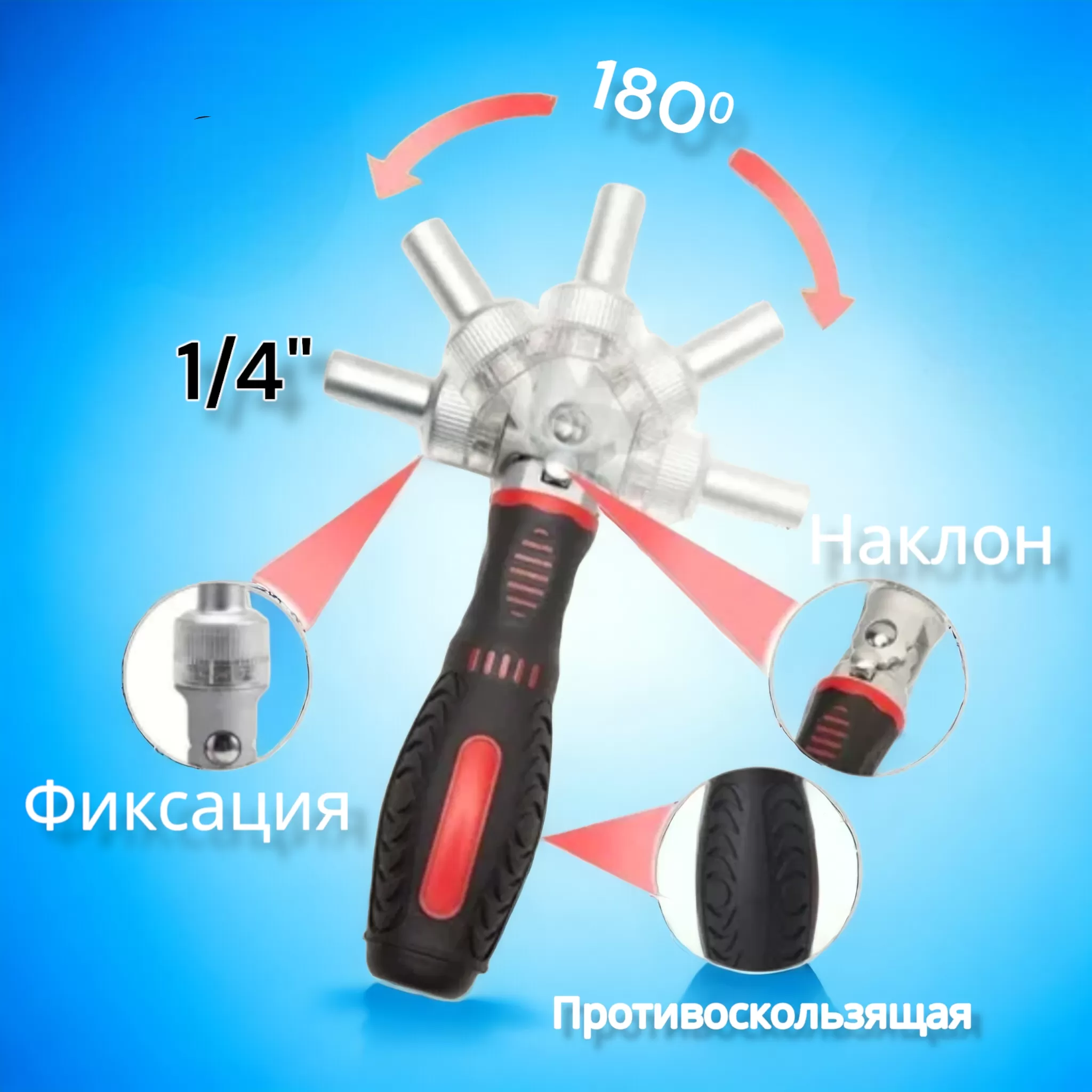 Храповый механизм на ручке позволяет работать, не отрывая отвертку от винта с поворотом на 180. Удобная прорезиненная диэлектрическая ручка отвертки обеспечивает комфортную работу.Продуманный механизм хранения позволяет повесить набор на стену.