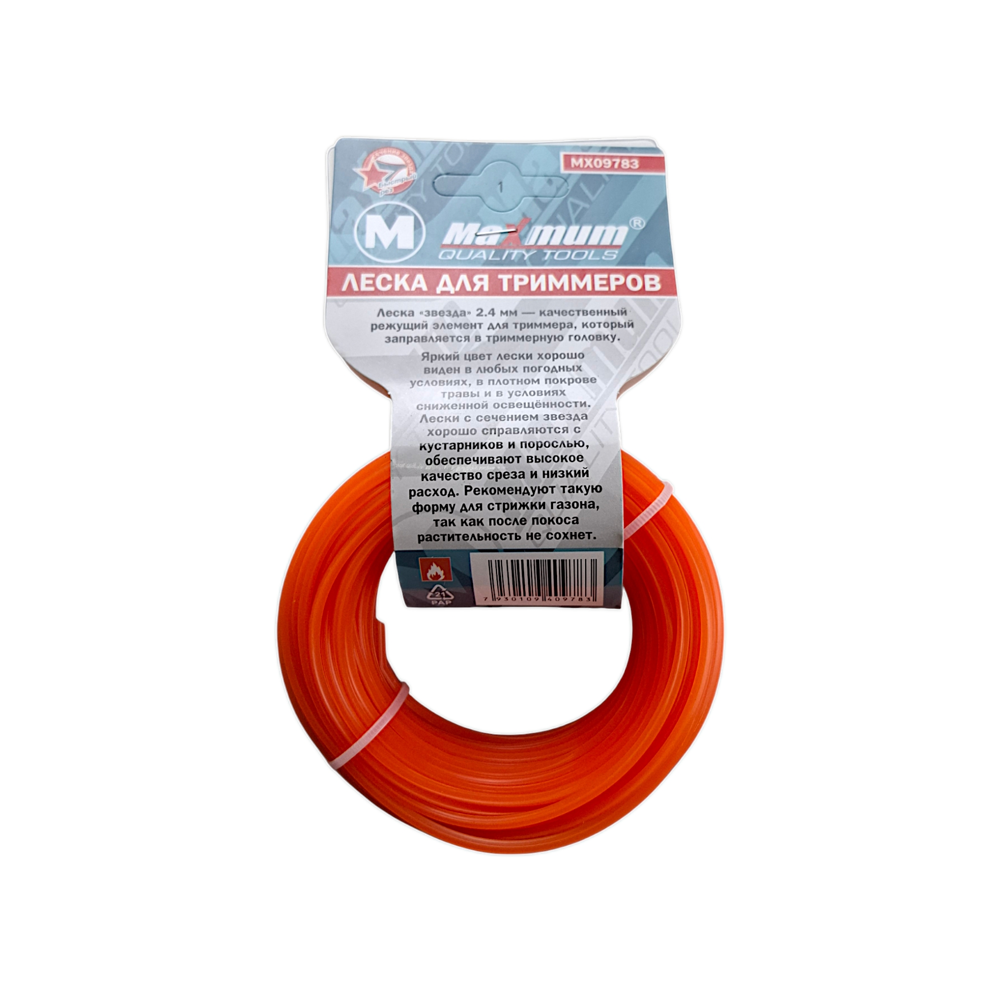 Триммерная леска "звезда" 2,4 мм изготовлена из полиамида (нейлон и функциональные добавки) и предназначена для скашивания как густой зеленой травы, так и сухого многолетнего кустарника. Струна триммерная пятиугольного сечения длиной 15 метров имеет острые кромки и подходит для максимально аккуратных работ.